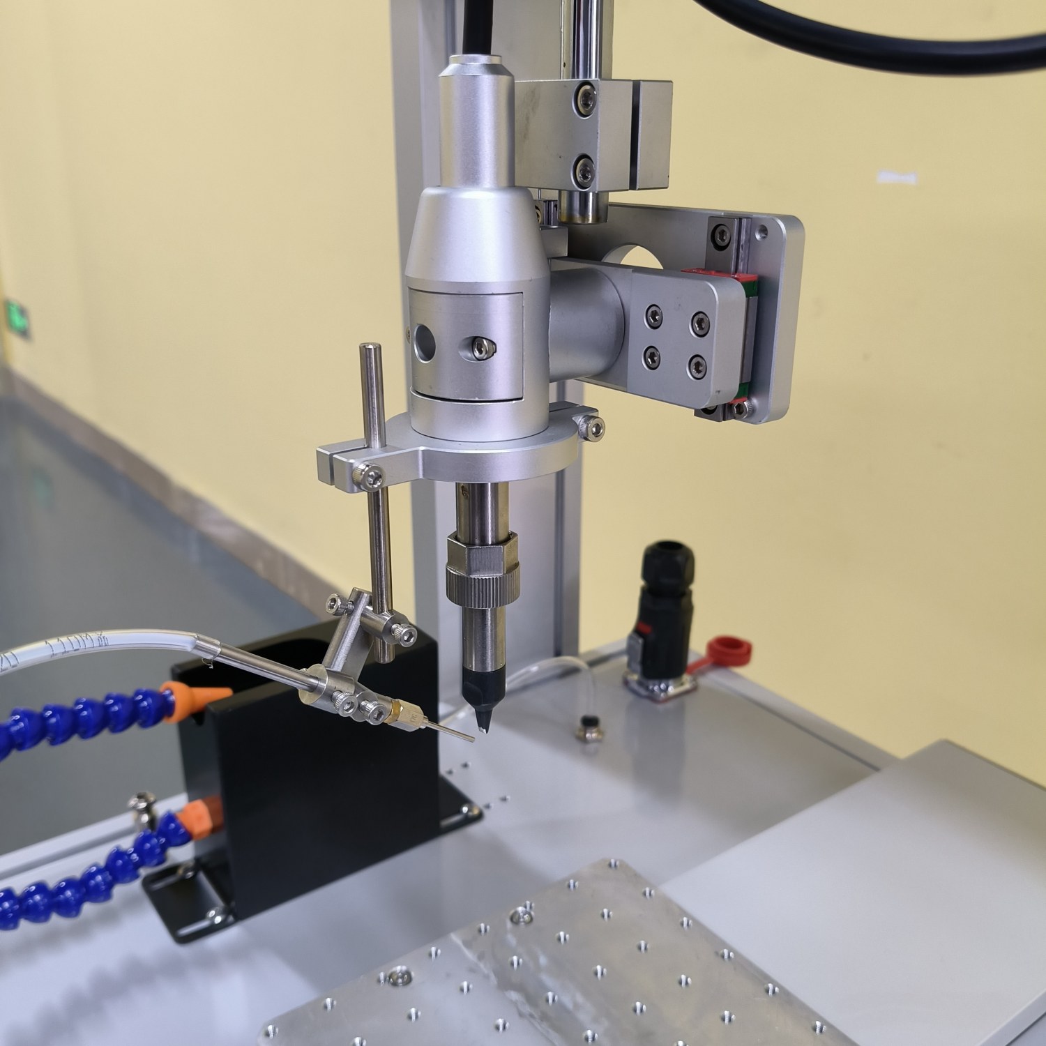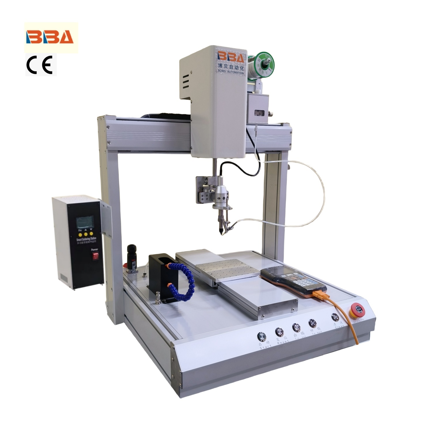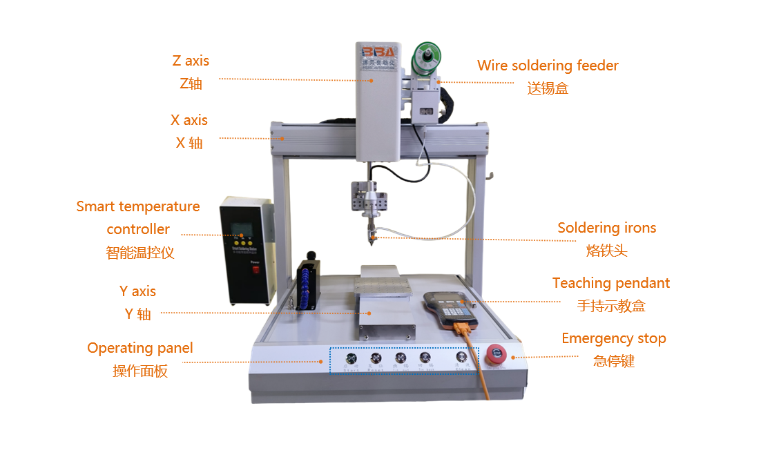 This BBA industrial-grade robotic soldering machine features an iron tip and auto wire feeding, designed for electronic components. It delivers precise, efficient soldering with automated wire supply, ensuring reliable performance in industrial assembly lines for electronic parts.